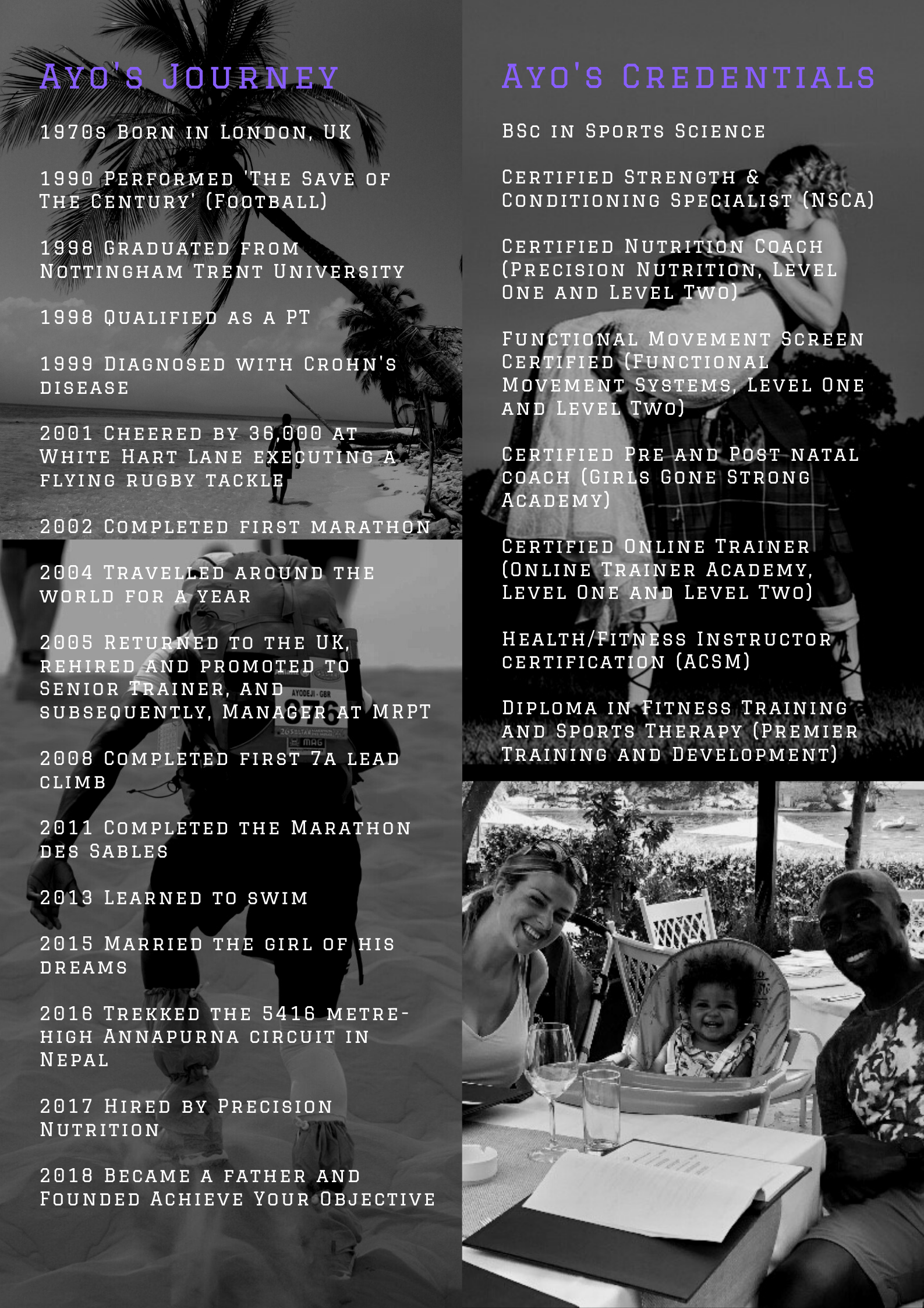 After completing a Sports Science degree, I set up as an independent Personal Trainer and Sports Massage therapist before joining Matt Roberts Personal Training in 2000. I went on to train, manage and mentor teams of trainers and support staff for over a decade-and-a-half at what was the UK’s pioneering Personal Training provider. Following a year spent working for the renowned Precision Nutrition, Achieve Your Objective Training + Nutrition was set up – the goal: to bring two decades of expertise and successful formulae to an audience beyond central London.